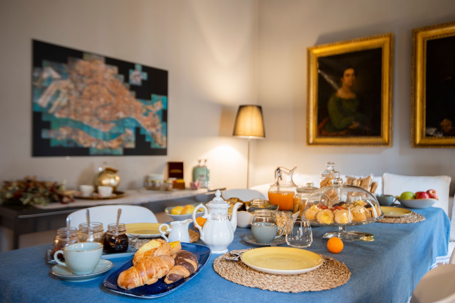 La colazione viene servita ogni mattina dalle 8:30 fino alle 10:30 nel soggiorno del B&B a Venezia San Marco, le cui finestre si aprono sul canale sottostante e da cui entra la musica al passaggio delle gondole in serenata.